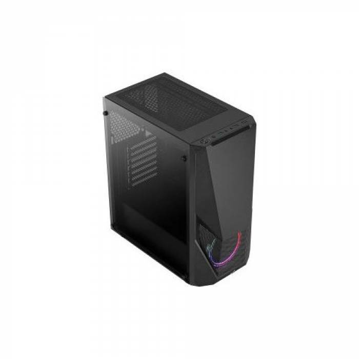 Carcasa Aerocool Zauron fRGB neagra, SPCC ABS Steel ATX Mid Tower, fara sursa (tip ATX, montata jos), interior vopsit negru, 2x3.5” (1 x 3.5” si 1 x 3.5”/2.5″ intern), 4x2.5” (2 x 2.5” si 1 x 2.5”/3.5” intern), fata – 1x 120mm LED fRGB fans (inclus) / 2x 120mm / 2x 140mm fans (optional), spate – 1x 120mm fan (optional), tavan – 2x 120mm fans (optional), design premium cu panou lateral din sticla securizata, 2x USB 3.0, 1x USB 2.0, HD Audio, ATX / microATX / Mini-ITX, sloturi expansiune: x7, inaltime maxima cooler procesor: 166mm, lungime maxima placa video: pana la 325mm fara radiator montat, suport radiatoare water cooling: fata – 1x 120/240mm, spate – 1x 120mm, dimensiuni (HxWxD): 442x217.7x409mm