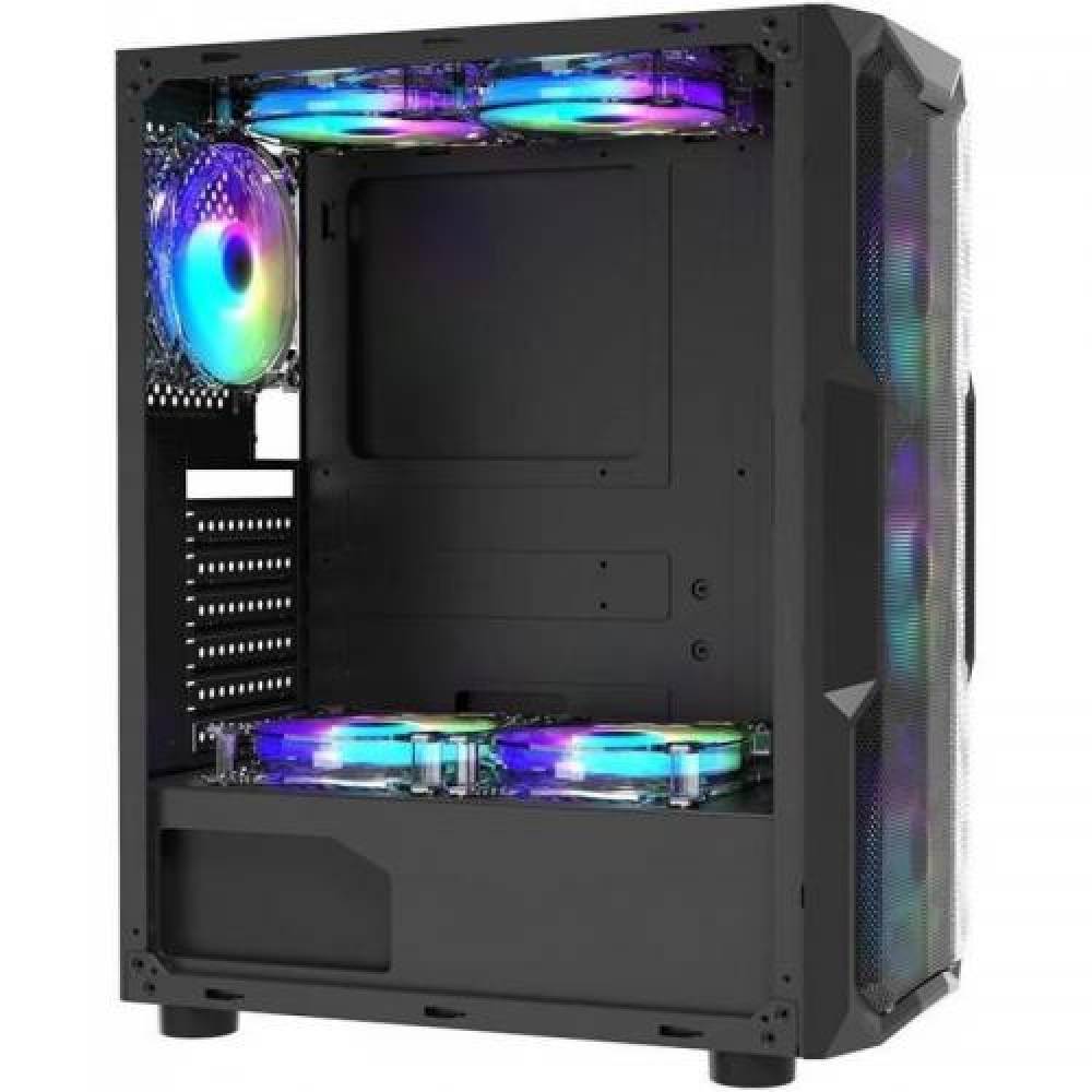 Carcasa Inaza Aquarius Mesh negra, SPCC Steel ATX Mid Tower, fara sursa (tip ATX, montata jos), interior vopsit negru, 2x2.5” (intern), 2x 3.5” (intern), fata – 3x 120mm LED aRGB fans (inclus), spate – 1x 120mm LED aRGB fan (inclus), tavan – 2x 120mm fans (optional), podea – 2x 120mm fans(optional), design premium cu panou frontal din mesh metalic si panou lateral din sticla securizata, 1x USB 3.0, 2x USB 2.0, HD Audio, ATX / microATX / Mini-ITX, sloturi expansiune: x7, inaltime maxima cooler procesor: 165mm, lungime maxima placa video: 320mm, suport radiatoare water cooling: fata – 1x 240mm, tavan – 1x 240mm, dimensiuni (HxWxD): 450x195x370mm, greutate: 5.5kg