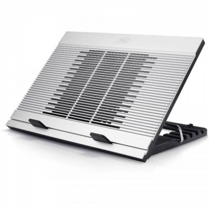 Deepcool N9, structura din aluminiu si plastic, dimensiune notebook: 17” (maxim), 180mm fan (600-1000 RPM, 84.7 CFM, 16-20 dBA, include fan controller), patru porturi USB, alimentare prin portul USB, sase unghiuri de inclinare, design anti-alunecare, dimensiuni: 380x279x34mm