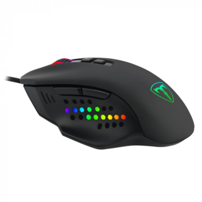 Mouse gaming T-Dagger Captain negru, 8000 DPI, 1000Hz, 20G acceleratie, numar butoane mouse: 8 (7 programabile), iluminare LED RGB a mouse-ului, picioruse de teflon, cablu imbracat in material textil, lungime cablu mouse: 1.8m, dimensiuni: 126x74x42mm, greutate: 146g, USB