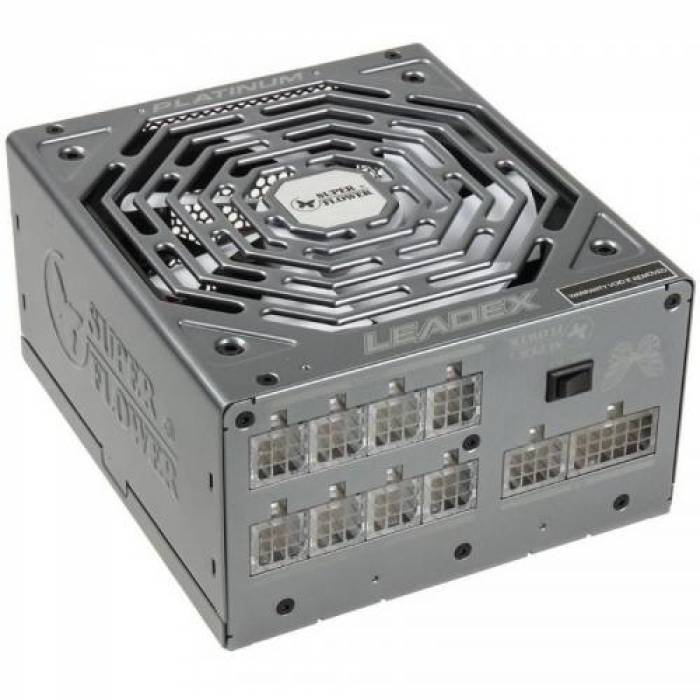 Super Flower Leadex Platinum 850W Black Modular PSU, certificata 80 PLUS Platinum, eficienta 92%, cabluri full modulare pentru un wire management mai bun, single rail (70.8A), ventilator silentios de 135mm (Fluid Dynamic Bearing) cu tehnologie ECO Intelligent Thermal Control System (ventilatorul nu incepe sa se roteasca pana ce temperatura interna a sursei nu atinge 55