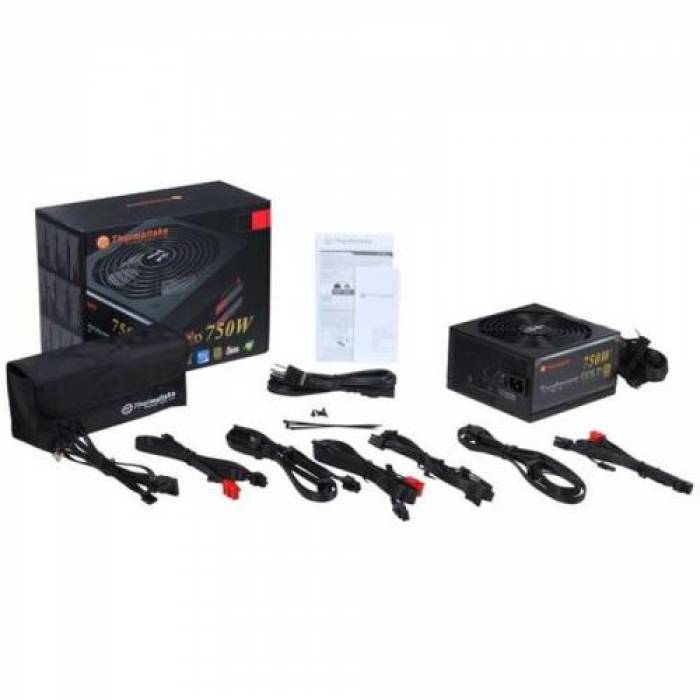 Thermaltake Toughpower 750W Gold Modular PSU, certificata 80 PLUS Gold, eficienta 92%, Haswell Ready, cabluri modulare plate pentru un wire management mai bun, single rail (62A), condensatori electrolitici japonezi, ventilator silentios de 140mm double ball-bearing cu control termic automat (nivel de zgomot de aproximativ 18dB la o incarcare normala), 4x 6+2pin PCIE, 12x SATA, 4x Molex, 1x Floppy, 1x 4+4pin EPS12V, SCP/OVP/OCP/OPP/UVP, certificari: UL, TUV, CE, FCC, BSMI, GOST, Active PFC, dimensiuni (h/w/d): 86 x 150 x 160mm, ATX 12V 2.3