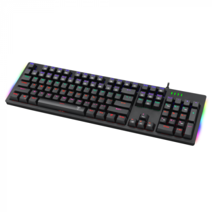 Tastatura gaming mecanicaT-Dagger Bermuda neagra iluminare alba switch-uri albastre, toate tastele fara conflict (n-key rollover), switch-uri albastre Outemu, iluminare LED Ice Blue (diferite moduri de iluminare, reglarea intensitatii), 8 taste multimedia, tasta WIN poate fi dezactivata in timpul jocurilor, taste durabile (double shot inject), conector USB, dimensiuni: 444x134x48mm