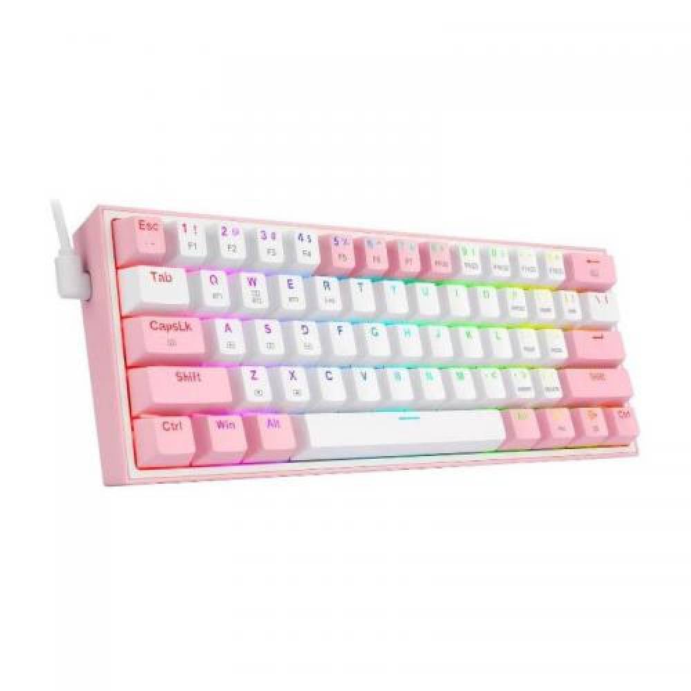 Tastatura gaming mecanica Bluetooth cu fir si wireless Redragon Fizz Pro alba cu roz iluminare RGB switch-uri rosii, toate tastele fara conflict, 61 taste (n-key rollover), switch-uri rosii Redragon (durata de viata: 50 de milioane de apasari), 4 switch-uri rosii de schimb, protocol bluetooth: 5.0, se pot conecta 3 device-uri simultan (se selecteaza device-ul pe care il folositi din combinatia de taste FN si Q, W,si E), baterie: 1600mAh, protocol wireless 2.4 Ghz, iluminare LED RGB a tastelor (posibilitatea reglarea intensitatii luminoase, 13 moduri de iluminare), tasta WIN poate fi dezactivata in timpul jocurilor, caracterele de pe taste nu se sterg datorita constructiei prin injectie dubla de plastic (double shot injection keycaps), cablu detasabil, conector USB Type-C, dongle wireless USB, dimensiuni: 296x105x45mm, greutate: 459g